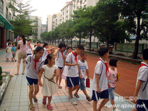 2011年9月3日,泉州二实小新学期开学典礼在操场举行。庄严的升国旗仪式之后,紧接着举行赠送爱心联系卡活动。五年级学生向一年级的新生赠送亲手制作的爱心联系卡,上面写有温馨的祝福和联系的方式;接着带领一年级学生熟悉校园。校长在国旗下讲话中,要求高年级的学生要关心、爱护一年级的小同学,带领他们尽快适应校园生活;同时,也要严格要求自己,调整状态,以良好的精神风貌开始新学期的学习。