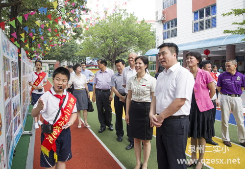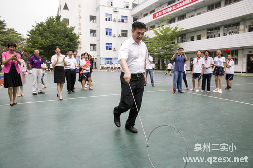 慰问活动中,领导们首先参加了学校“喜迎十九大——我向习爷爷说句心里话”主题队日活动,参观了红领巾社团开展的现场书法、海丝长卷绘画等活动,饶有兴致地参与体育社团的闽南民间游戏活动,和孩子们一起跳8字长绳,滚铁环,受到了孩子们的热烈欢迎。