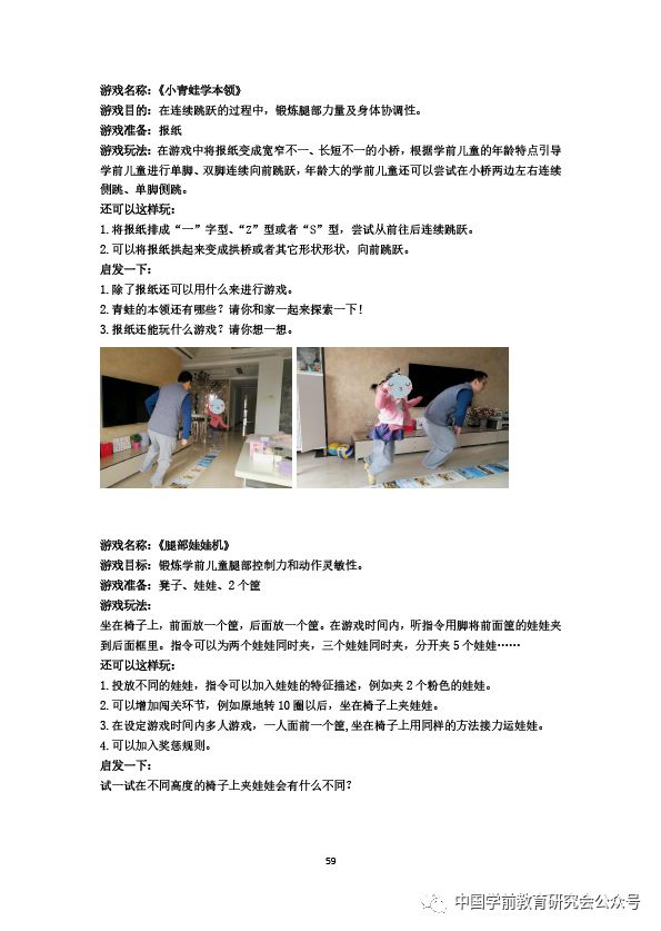 2020年初,突如其来的新型冠状病毒肺炎,让鼠年春节的欢乐气氛还没有进入高潮便戛然而止。接下来中国绝大多数的家庭开始了“闭门不出”的生活,孩子的生活也发生了天翻地覆的变化。原定的走亲访友和各种出游计划忽然取消了,孩子们日常与小伙伴玩耍的机会没有了,连户外活动也基本被禁止。取而代之的是新闻里、大人口中种种与冠状病毒有关的信息,还有人们谈起病毒时言语中表情里所透露出的焦虑和恐慌。偶尔必须出门要戴口罩了,大人对自己洗手的次数和时间要求也提高了很多,而这样的状况还不知道什么时候会结束……为了让学前儿童安然并尽可能快乐而有意义地度过这段特殊的时光,帮助家长在家开展游戏活动,中国学前教育研究会游戏与玩具专委会汇编了本《指南》。我们在相应部分注明了编写者的姓名、单位信息,对他们的付出表示感谢!由于时间所限,我们未能调动更多的人参与编写工作,深表遗憾!本《指南》并没有提供自主游戏,这并不意味着我们不主张自主游戏。我们希望,家长能够首先保证学前儿童自主游戏的时间。虽然我们强调亲子游戏,但我们更强调儿童自己游戏。我们希望家长能够尽可能避免中断学前儿童的游戏,来开展自己认为重要的、价值更大的游戏的现象。本《指南》中的“游戏”,不包括电子游戏、网络游戏。我们希望本《指南》,能够帮助家长减少学前儿童使用电子媒体的时间,而不是“粘”在手机、电脑、电视上。我们希望真实游戏成为孩子的基本活动,而不是虚拟游戏。本《指南》不是游戏大全,不是对所有游戏的收集、汇编。我们希望基于特殊时期家庭的特殊需要、室内游戏的特殊问题,有针对性的提供一些支持。本《指南》不是“课表”,不是要家长从头到尾、一个接一个地开展所有游戏。我们希望家长面对众多的信息(包括本《指南》所提供的信息),能够有所分析、有所判断,根据自己的实际情况,有所选择地开展。本《指南》中的游戏不是“教案”、不是“上课”,不是必须这样做、必须这样游戏。我们希望家长能够尊重孩子游戏的自主性,创造性地开展游戏活动。本《指南》只涉及“游戏”,但并不是说孩子一天到晚只有游戏、只有某种游戏。我们希望,家长朋友们能够合理安排孩子的一日生活,在有限的空间里,精彩地生活。
