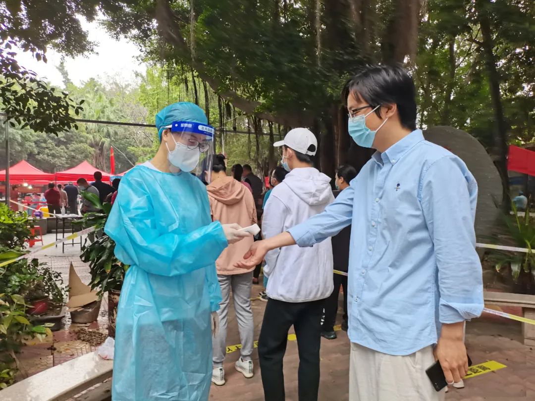 “为什么党旗美如画,党员的行动点亮她!” 3月17日,丰泽区开展第四轮全员核酸检测。泉州市第二实验小学的党员教师志愿者踊跃参加,奔赴抗疫前线。 清早,我校7位党员教师志愿者已经集结在丰泽新村核酸检测点开始做准备工作,互相配合,穿防护服、戴防护罩。 在重重的防护下,已经很难辨识彼此,但防护罩下坚毅的眼神都诉说着一个共同的目标,尽自己的绵薄之力,让疫情早日结束,握紧拳头,为泉州加油,为中国加油。 进入检测区域,首先就要测量体温,入口处有两位“蓝衣战士” 在耐心地为居民测量体温,引导大家排队,还安抚焦虑的老人家。他们的手,几天前还握着粉笔,写着板书;他们的嗓音,几天前还回荡在教室、操场。 大家有序地排队等待检测,顶棚映照出的红光笼罩在另外几位“蓝衣战士”身上,他们弯曲的脊背是多么熟悉,是在办公室伏案批改作业的样子,不过今天,他们的手上,拿着的不是红笔,不是作业本,是一管管贴着编号的采样管,指尖点击的是大家通往“安全”的希望密码。 他们,把自己在教书育人岗位上的爱心、耐心、细心带到了抗疫战场上,“换下文装上武装,初心不改党旗扬”。