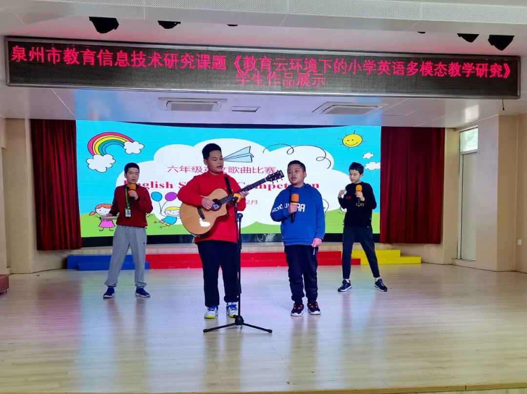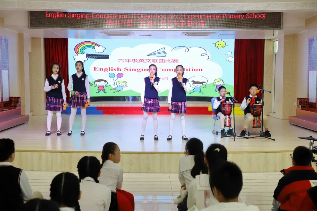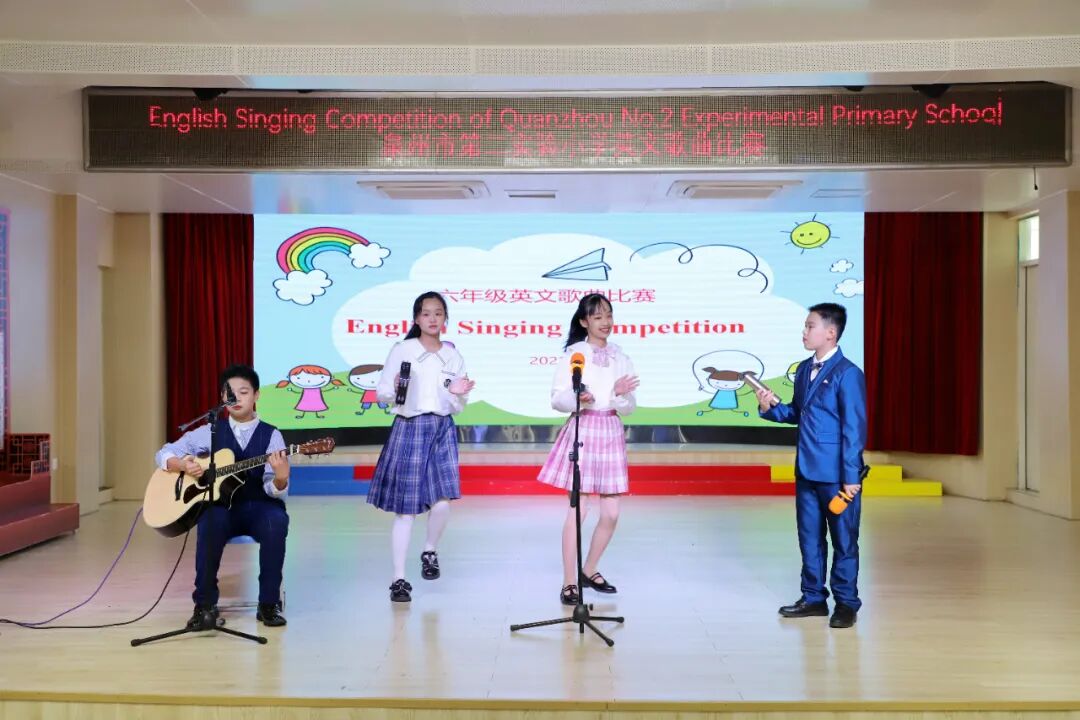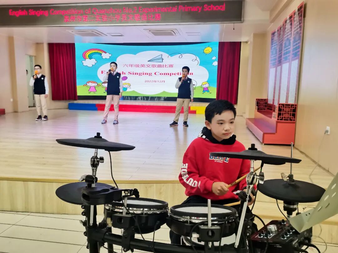 歌声洒满校园,处处洋溢着欢乐的气息。六年级英文歌曲演唱深受学生们的喜爱,他们或是吉他清唱,或是架子鼓伴奏,亦或是歌伴舞的形式。一段段优美动听的旋律,点燃了孩子们的激情,孩子们在感受英语之美的同时,锻炼自我、展示自我、张扬个性、放飞梦想。