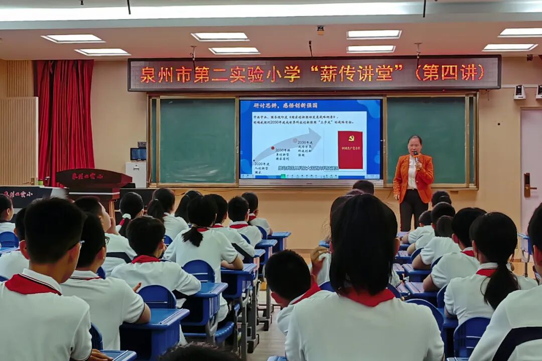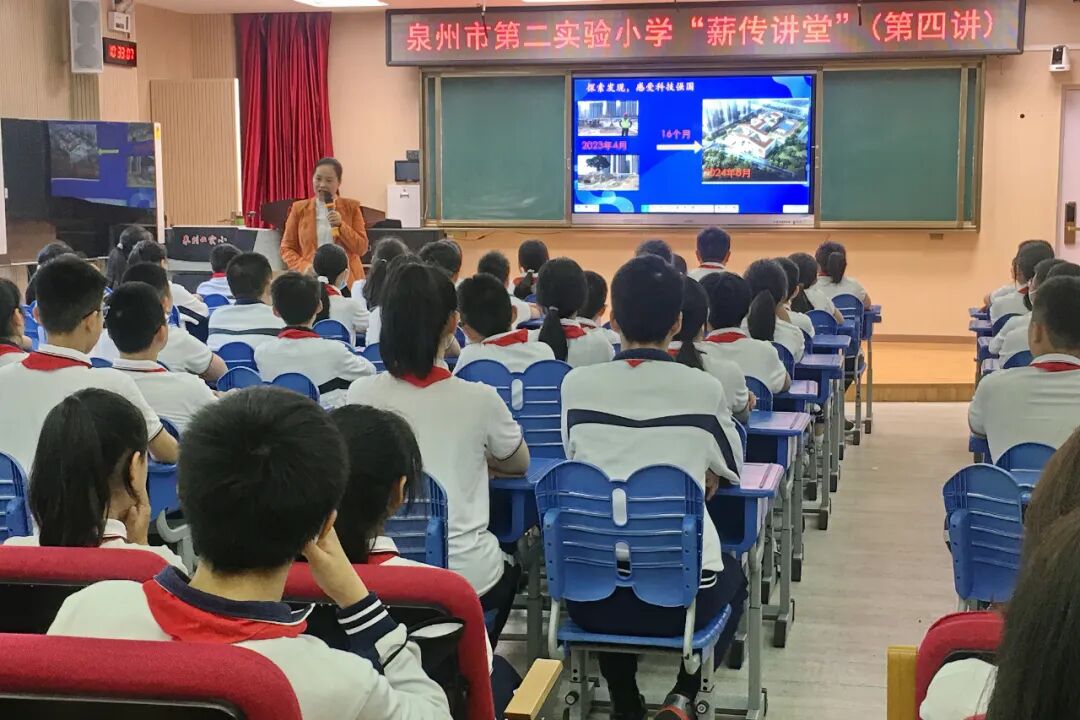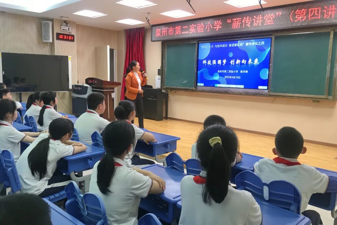 为积极营造爱科学、学科学、用科学的校园科技氛围,激发学生的创新思维,激励学生用青春的热情点亮科技时代精神的火炬,4月18日,泉州市第二实验小学陈华珠副书记以“学习二十大 与校共成长 奋进新征程”之“科技强国梦,创新向未来”为主题,开设“薪传讲堂”第四讲。活动由黄越靖老师主持。黄加贤校长、陈巧亮副校长、饶燕燕校长助理和六年一班、六年二班全体师生参加活动。