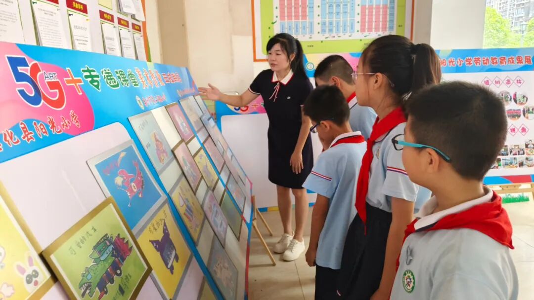 泉州市第二实验小学陈进、黄厚瑄、施宝珍三位老师走进教室,和孩子们进行线下见面、互动。孩子们见到了“5G+专递课堂”视频里的任课老师,倍感亲切,洋溢着一片欢声笑语。陈进老师和三年二班孩子们共唱《打秋千》歌曲;黄厚瑄老师鼓励孩子们要上好每一节科学课,做一个爱思考、肯钻研的好孩子;施宝珍老师和孩子们一起参观“5G+专递课堂”美术作业三校联展展板。