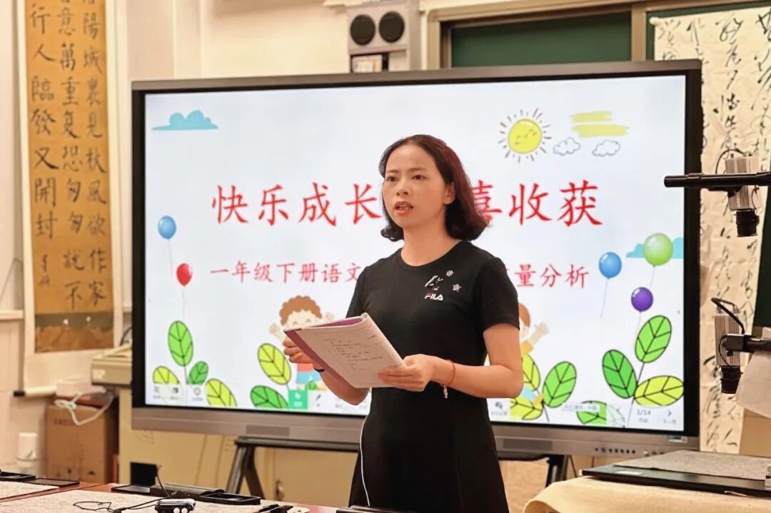 刘雪婷老师以“快乐成长,欢喜收获”为题,对学生在“识文断字”“连词成句”“熟读成诵”“能说会道”四个闯关项目中的过关情况进行了深入分析。