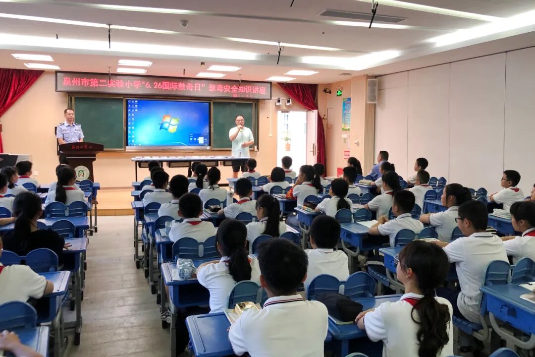 为了提高学生的禁毒安全意识,防范未成年学生参与吸毒,6月25日,在第37个国际禁毒日到来之际,泉州市第二实验小学与丰泽区禁毒办、丰泽区公安分局禁毒大队联合开展主题为“健康人生 绿色无毒”国际禁毒日系列宣传活动,参加活动的是学校四年级学生和各班安全员。丰泽公安分局禁毒大队教导员杜志坚,泉州市第二实验小学法治副校长谢劲鹣、副校长王思业到场指导,讲座活动由总务保卫处杜清泉老师主持。