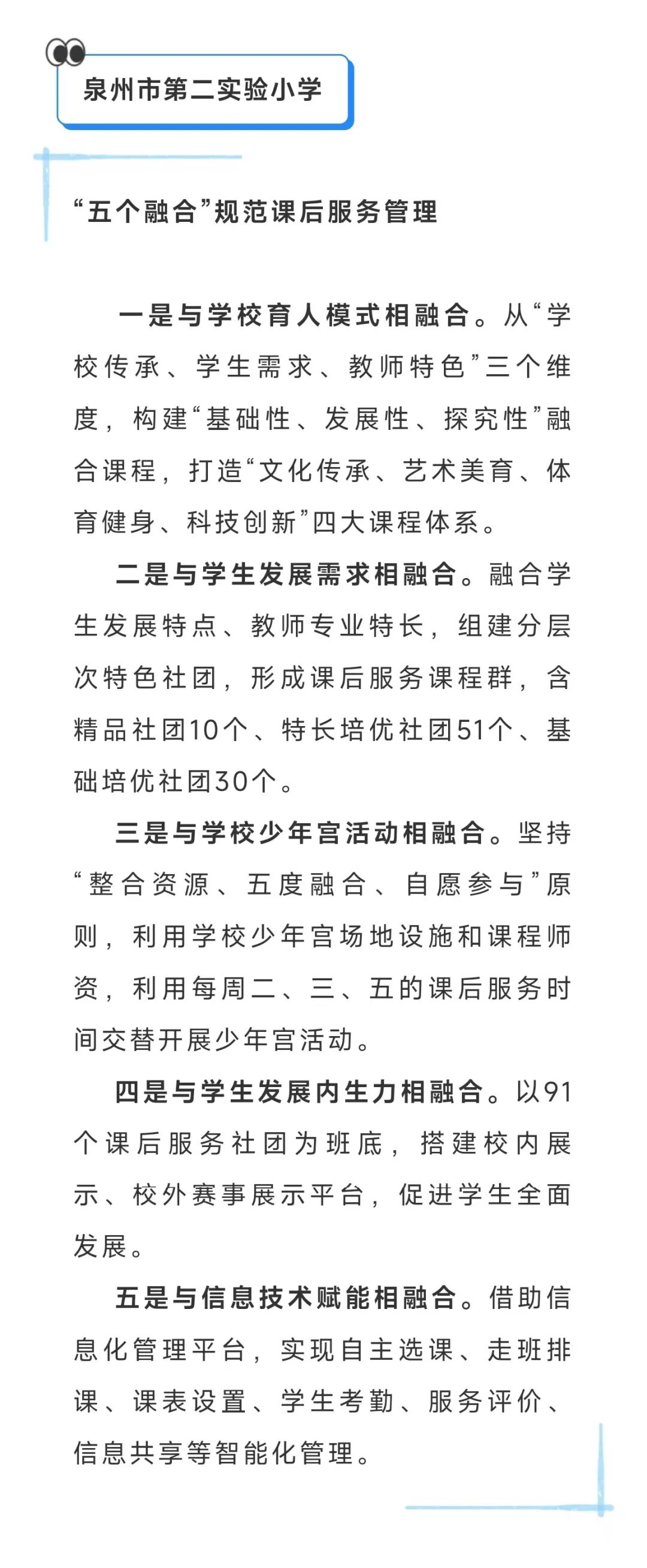 近日,泉州市教育局发布第三批课后服务工作典型案例名单,泉州市第二实验小学《“五个融合”规范课后服务管理》工作案例入选,在全市推广。