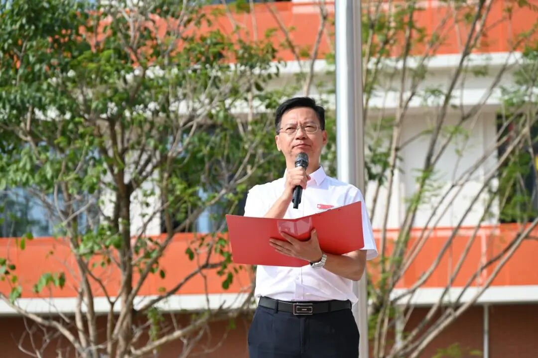城东北校区的开学典礼以庄严的升旗仪式拉开帷幕,随后,黄加贤校长发表新学期致辞。黄校长首先提议大家以热烈的掌声对新校区的正式开学表示祝贺,并代表学校对新同学表示热烈的欢迎。他在致辞中寄语新生们牢记学校的校训“学做人、会求知、健身心、育特长”,并祝愿同学们都能成为有道德、有智慧、有活力、有才华的优秀学生。
