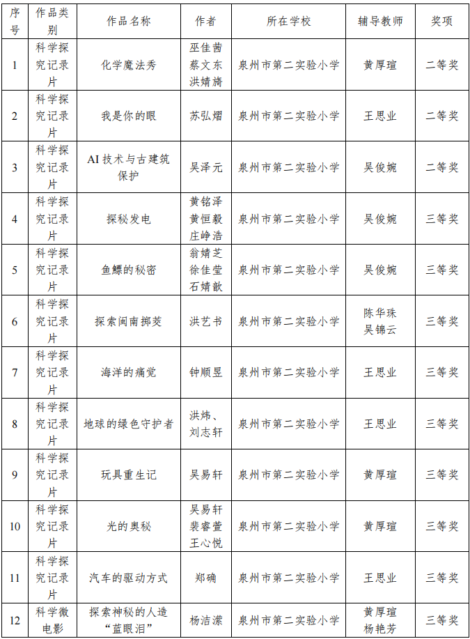 近日,由泉州市科协、泉州市教育局联合主办的第十届泉州市青少年科学影像作品竞赛活动获奖名单已揭晓,泉州市第二实验小学共有12项作品获奖,其中,科学探究纪录片获奖作品有11个:二等奖3个,三等奖8个;科学微电影获奖作品有1个:三等奖1个。