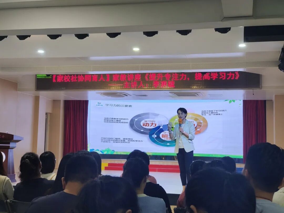 晚上七点,二年级家长和老师齐聚在学校一楼大厅小礼堂,一起聆听福建省心师协会家教指导师分会副秘书长李惠毓老师带来的精彩讲座《提升专注力,提高学习力》。活动由教科处陈静文老师主持。