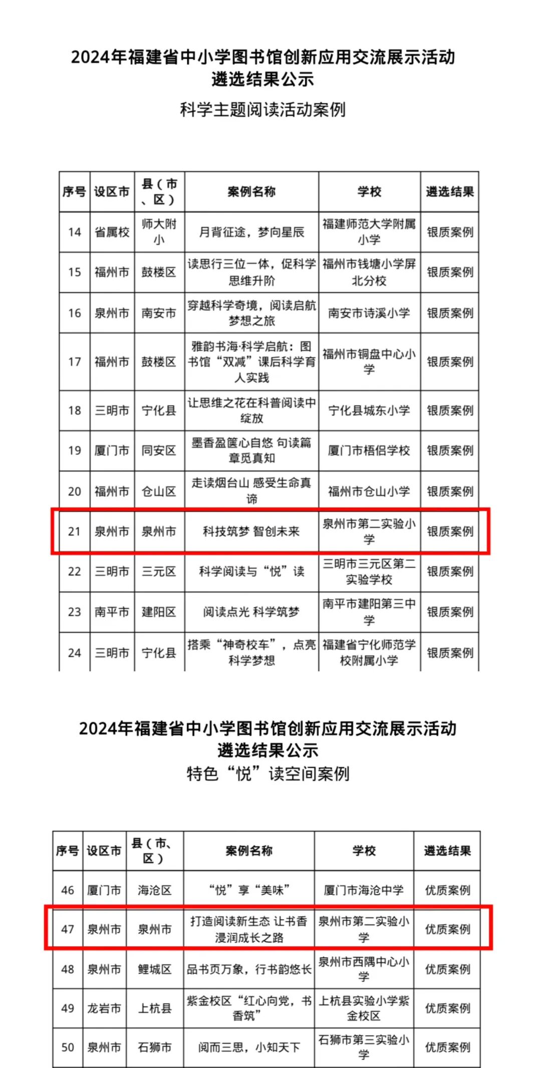 近日,由福建省教育装备与基建中心主办的2024年福建省中小学图书馆创新应用案例交流展示活动评选结果揭晓,泉州市第二实验小学选送的案例《科技筑梦 智创未来》(执笔:林秋菊)获科学主题阅读活动银质案例,案例《打造阅读新生态 让书香浸润成长之路》(执笔:陈淑贤)获特色“悦”读空间优质案例。