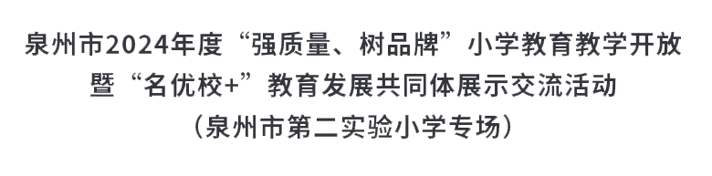 兹定于2024年11月28日(星期四)上午8:00在我校举行泉州市2024年度“强质量、树品牌”小学教育教学开放暨“名优校+”教育发展共同体展示交流活动(泉州市第二实验小学专场),诚邀您莅临关心指导!