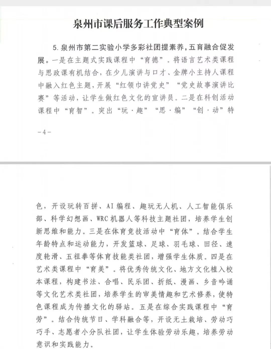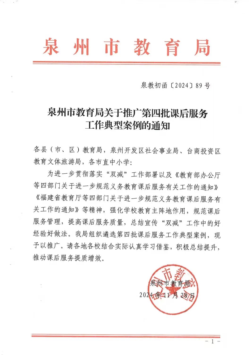 2024年11月28日,泉州市教育局发布第四批课后服务工作典型案例名单,泉州市第二实验小学《多彩社团提素养 五育融合促发展》工作案例榜上有名,在全市推广。