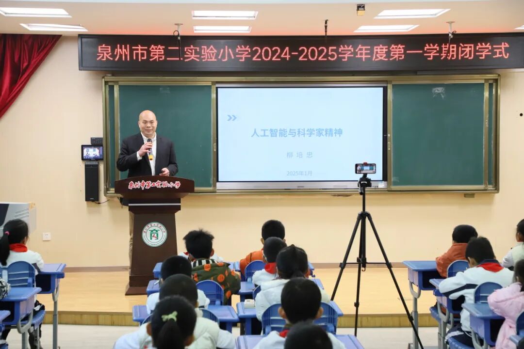 华侨大学教授、泉州市人工智能学会会长柳培忠博士受邀为师生们带来题为《人工智能与科学家精神》的讲座。柳博士以其深厚的学术底蕴和生动的讲解,将人工智能的发展与科学家们的探索精神娓娓道来,为同学们打开了科技知识的新视野,激发了同学们对科学的浓厚兴趣和对未来的无限憧憬。