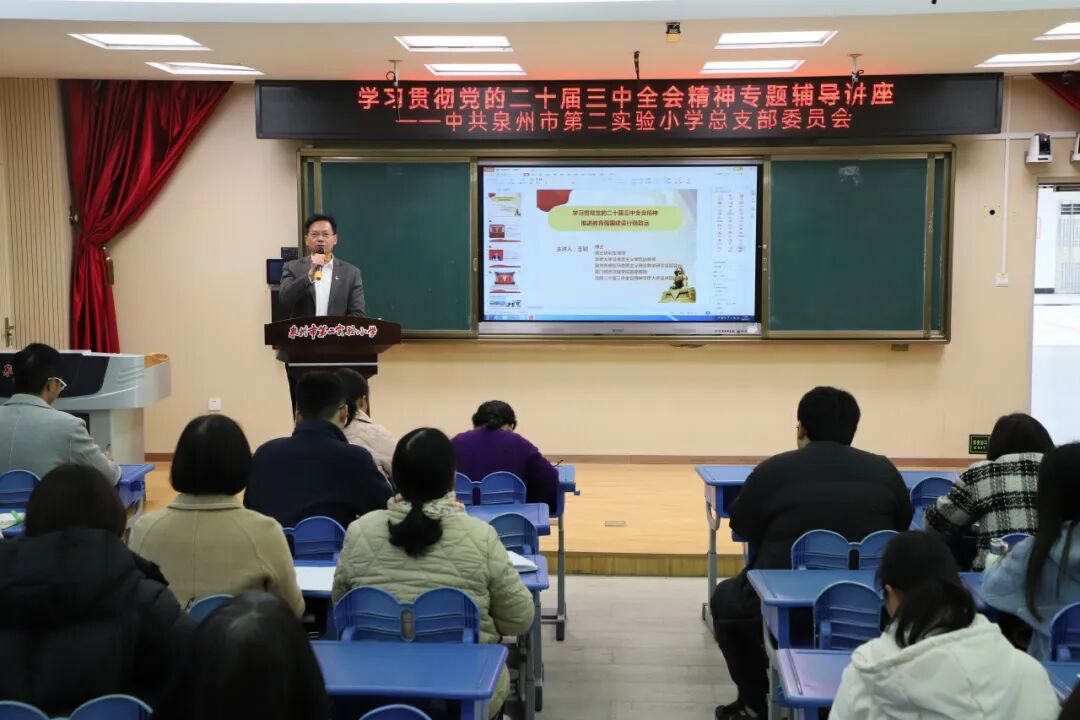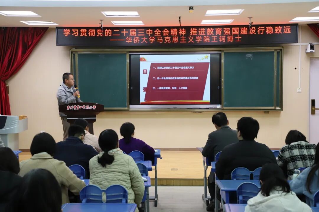 为推动教师深入学习贯彻党的二十届三中全会精神及全国教育大会精神,不断深化党纪学习教育,2025年1月17日,中共泉州市第二实验小学总支部委员会特邀华侨大学马克思主义学院副教授王轲为全体教师作《学习贯彻党的二十届三中全会精神 推进教育强国建设行稳致远》专题辅导讲座。
