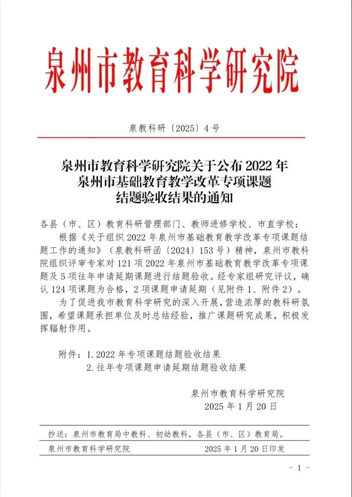 近日,泉州市教育科学研究院公布2022年泉州市基础教育教学改革专项课题结题验收的结果,泉州市第二实验小学两个课题验收合格。