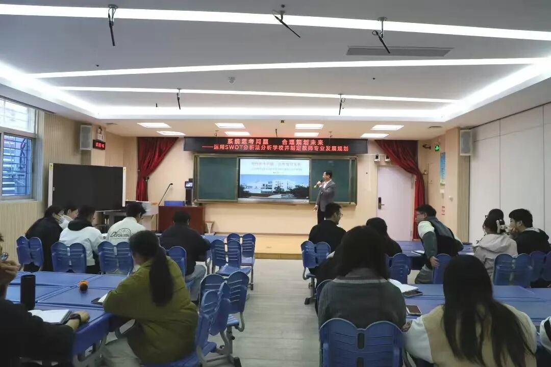 黄加贤书记为全体新教师作题为《系统思考问题,合理规划未来——运用SWOT分析法分析学校并制定教师专业发展规划》的精彩讲座。