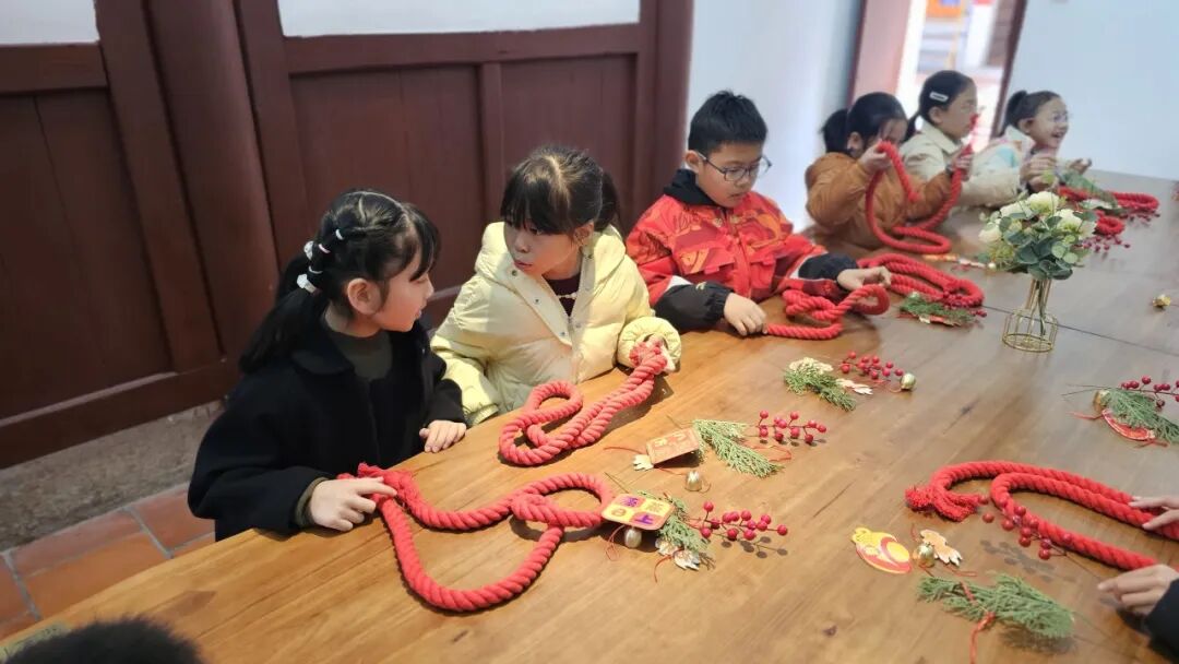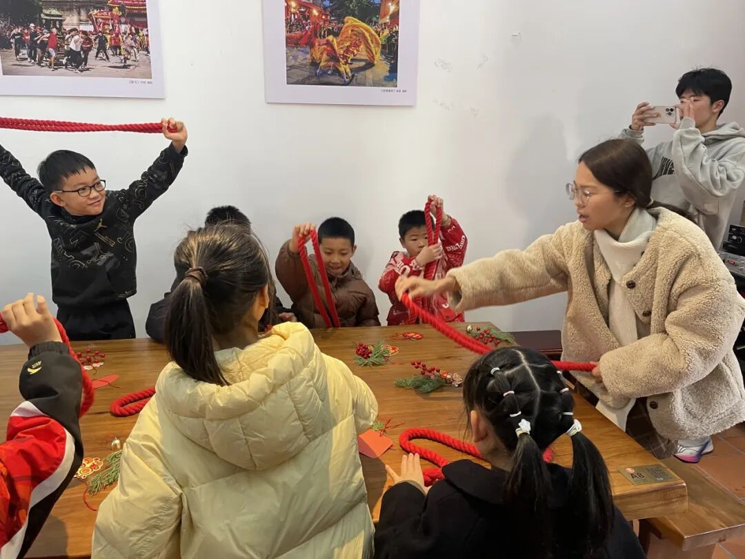最后,队员们分组动手制作万福结。非遗老师先为大家详细介绍了万福结的寓意和历史渊源。万福结象征着吉祥、幸福和万事如意,是中国传统结艺中的经典之作。随后,老师耐心地示范了万福结的制作步骤,队员们目不转睛地看着。在老师的指导下,他们纷纷拿起红绳,开始动手制作。只见红绳在他们手中上下翻飞,穿梭交织,不一会儿,一个个精美绝伦、富有个性的万福结便呈现在大家眼前。