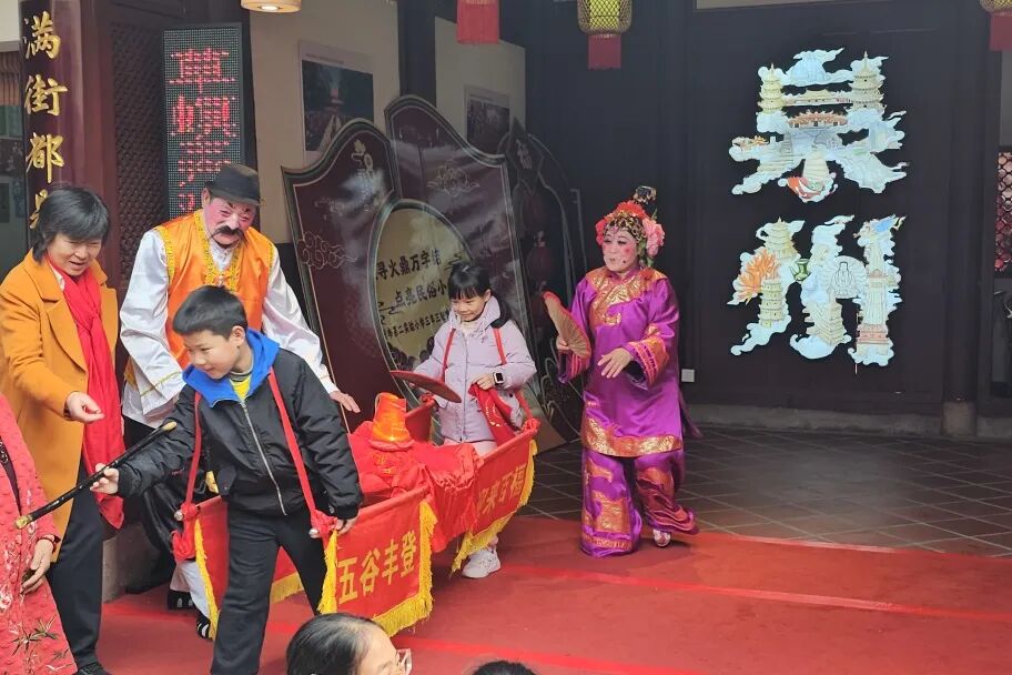 接着,队员们观看了由泉州非遗火鼎公婆第三代、第四代传承人带来的传统民间舞蹈——《草蜢弄鸡公》。泉州火鼎公婆源于泉州民间迎神赛会中的“火鼎踩路”,有“烧去千灾,迎来百福”之意。舞台上“火鼎公”和“火鼎婆”抬着用长竹竿驾着的、燃烧着熊熊火焰的大铁锅,随着民间小调起舞,表达了人们对扫除一路污浊、驱邪镇恶、风调雨顺、国泰民安的祈求。