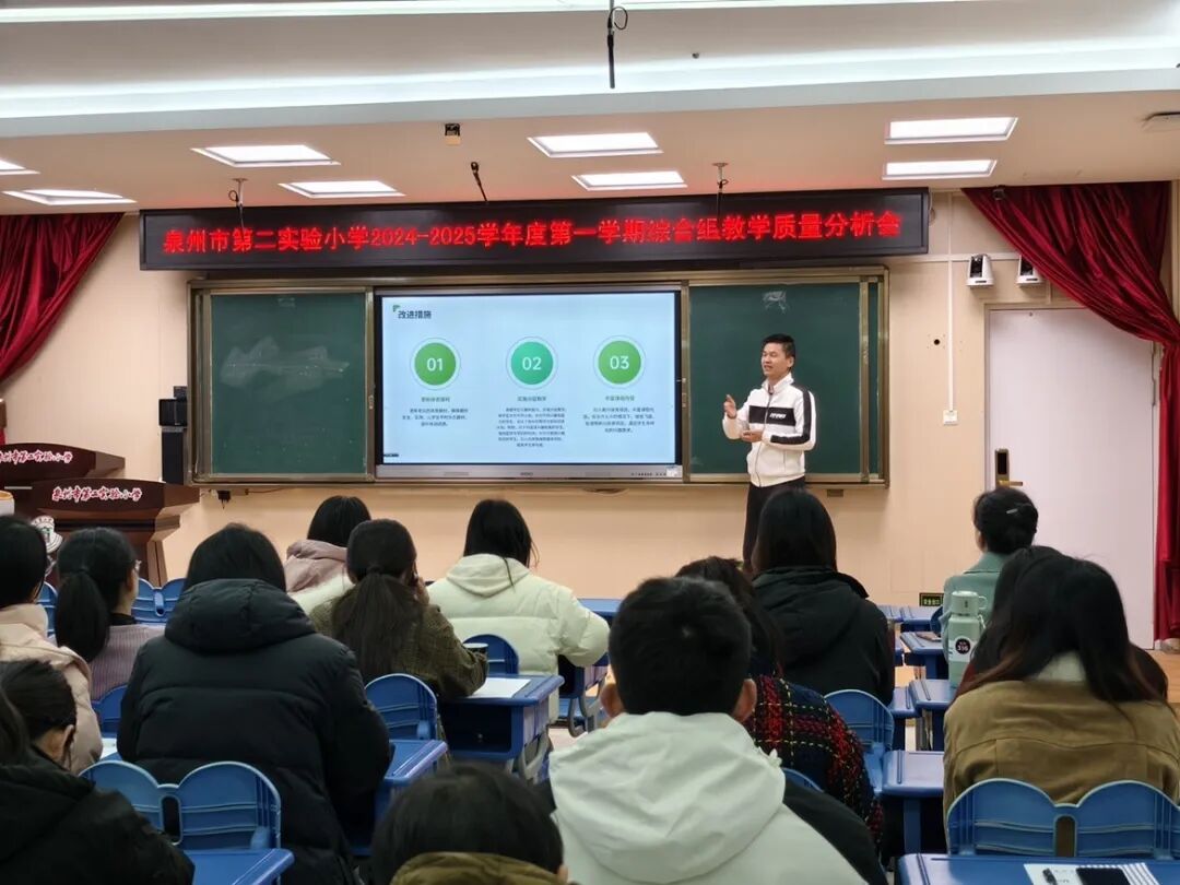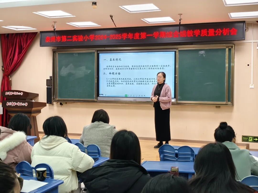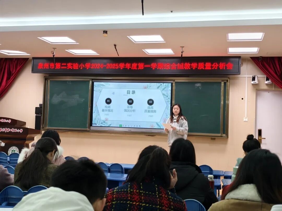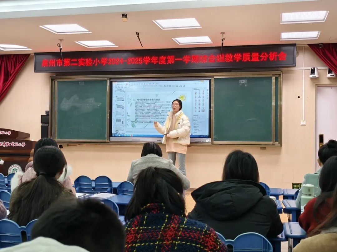 道德与法治组卢希婷老师主要从各年段期末考查形式、内容、效果及改进措施方面进行质量分析。她提出:要衔接生活,提升学生兴趣与认同感;根据高低年段学生实际情况实现教法多元融合,让课堂生动高效;拓展实践活动,深化学生道德认知;完善评价体系,全面客观衡量学生发展。未来,道法组也将继续努力,不断提升教师自身综合素质。