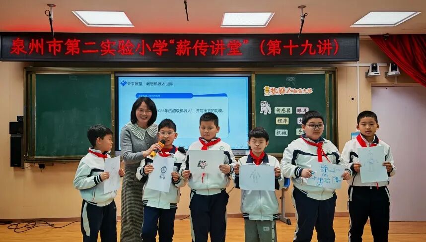 3月21日下午,泉州市第二实验小学“薪传讲堂” 第十九讲在多媒体教室开讲,主题为 “机器人探索之旅”,由第一党小组组长尤莲玉老师主讲,部分学校行政和四年级师生参与。