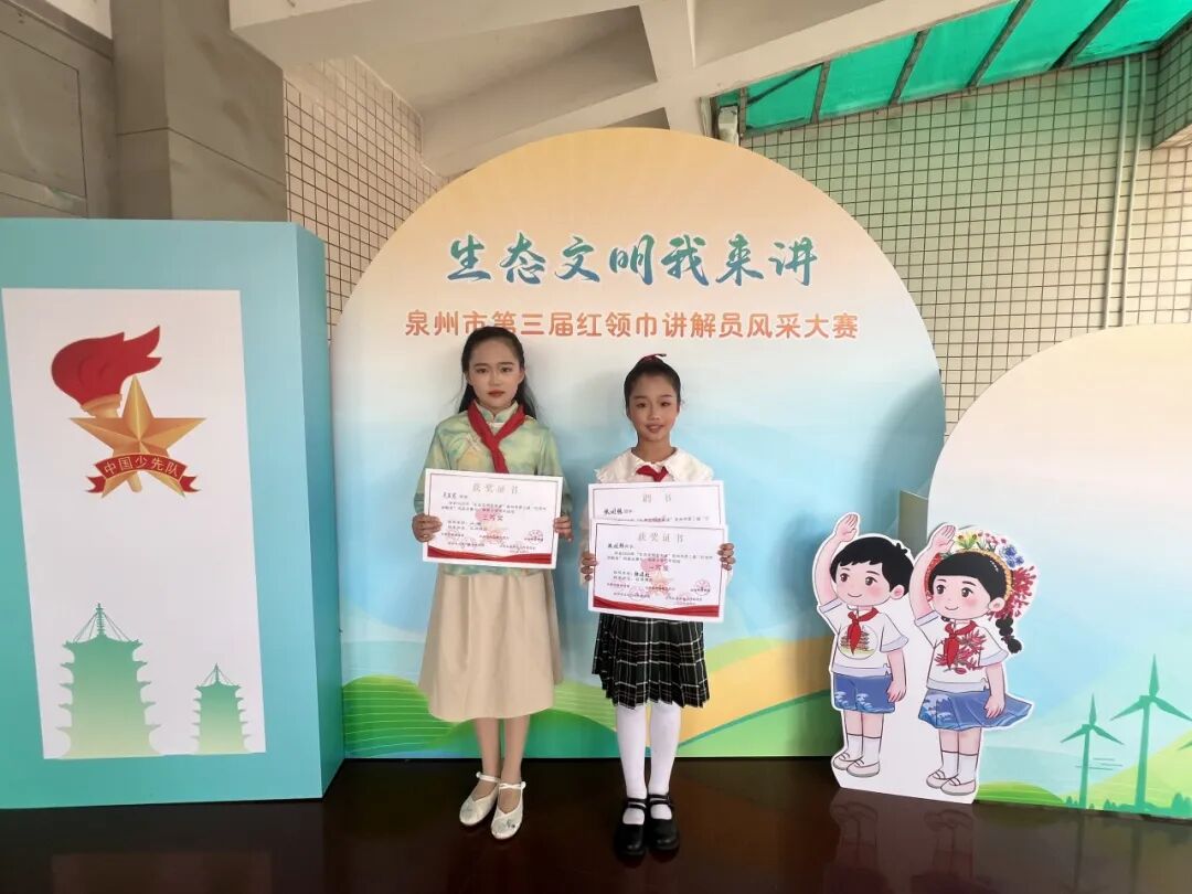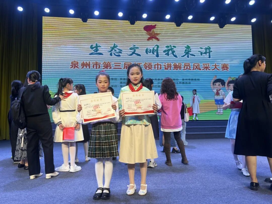 4月11日上午,“生态文明我来讲”泉州市第三届“红领巾讲解员”风采大赛圆满落幕。学校三(4)中队张润林荣获小学低年级组一等奖,四(1)中队吴宸霏荣获小学高年级组三等奖!载誉而归,为学校争得了荣耀。