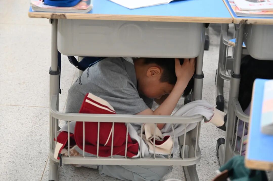 上午第三节课即将下课,丰泽校区和城东北校区突然响起急促的警报声,演练活动正式拉开帷幕。正在授课的教师迅速指挥学生进行原地避震,全体同学立即响应,迅速拿起课本护住头部,蜷缩身体躲至课桌下方进行紧急避震。