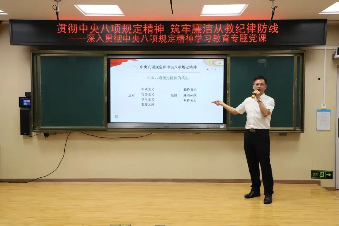 最后,他强调,中央八项规定精神已经走向常态化、制度化、规范化。我们身为党员教师,肩负育人重任,要认真贯彻中央八项规定精神,筑牢廉洁从教纪律防线,以廉洁奉公的姿态为学生树立榜样,守护教育的神圣与纯洁。
