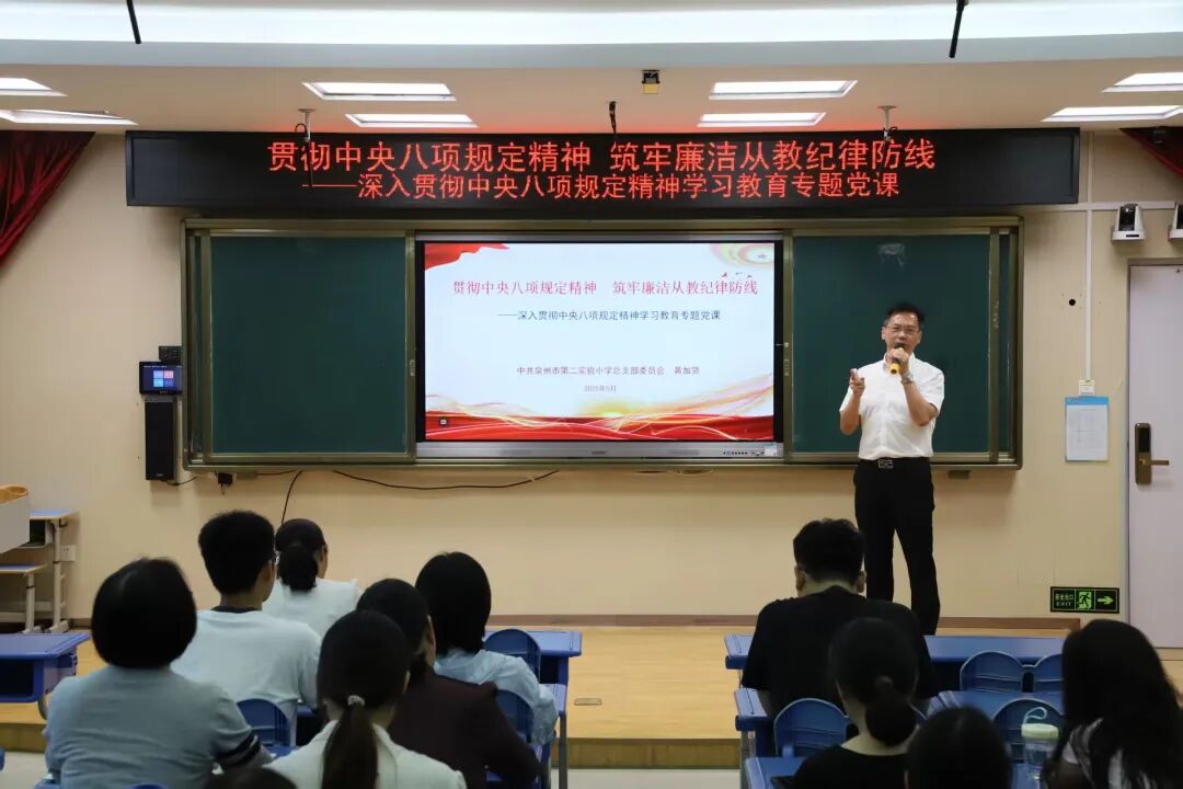 为深入学习贯彻中央八项规定精神,强化教师队伍纪律意识,营造风清气正的教育生态,5月12日下午,中共泉州市第二实验小学总支部委员会黄加贤书记以“贯彻中央八项规定精神,筑牢廉洁从教防线”为题,开设贯彻中央八项规定精神学习教育专题党课,全体教师参加。